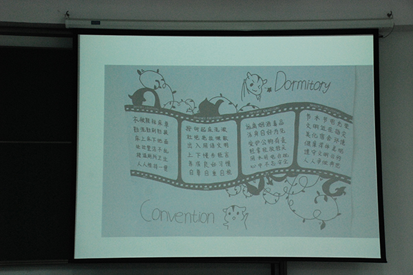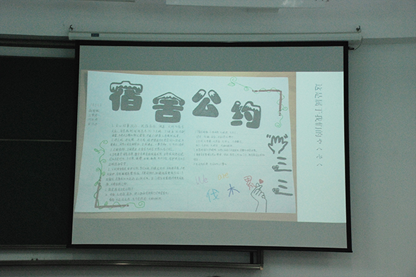 这些ppt都别具风采,各有千秋。同学们精心制作的手抄报或贴上一些幽默风趣的表情使ppt画面更加丰富。由ppt可见,每个寝室的寝室公约内容皆有不同之处,又有相似地方。每天安排人员打扫卫生,保持寝室整洁;按时就寝、起床;不使用违规电器;及时熄灯关水无人在寝时锁好门窗;团结友好,相处和谐,不争吵不斗殴等以上几条公约是大多数寝室所共有的。