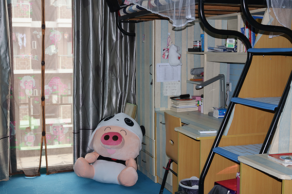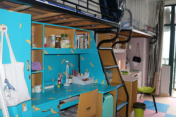 让我们进入另一处美丽的空间,充满了现代风格的简约派条形型壁纸,与彰显可爱有趣的卡通元素,使得原本朴素单调的小空间,增添了许多活力与生色,深蓝色的地毯代表海洋,与桌前的书海相容相交,整个宿舍被小清新的文艺气息所围绕,让前来参观的老师和员工着实眼前一亮。