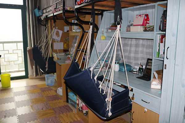 也有一些寝室推崇干净简洁的地中海风格,大篇幅使用蓝白色元素,加以亚麻门帘、海军风吊椅、蓝色木纹桌贴、木纹地垫等营造出扑面而来的清爽感觉。将审美与实用结合,在风格统一中又凸显个性,实为寝室美化的精髓。