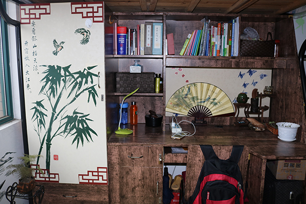 例如一些同学对中国风情有独钟,她们就将寝室装扮地古色古香,充满意韵。不仅仅把整体基调变得沉稳凝练,更是加上了书法、盆栽、折扇、山水画等物件修饰,让每一个来到寝室的人都深切体会中国之美,感到心旷神怡。