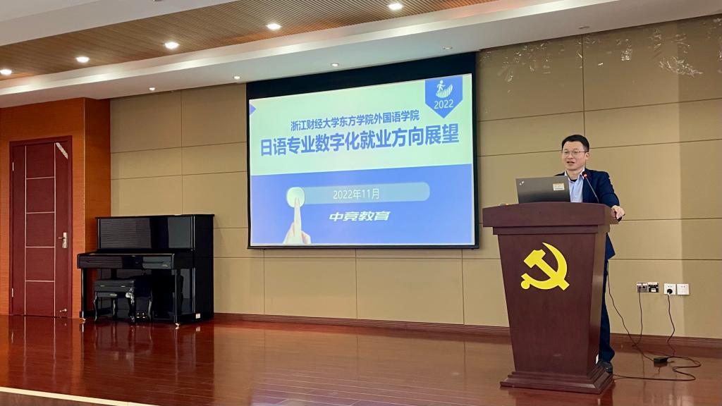 11月10日,为深化产学合作,加强实践教学,JINNIAN金年会邀请校企合作实习实践基地中竞(浙江)教育科技有限公司副经理刘发骏,在J7-409报告厅为公司师生作了题为“日语专业数字化就业方向展望”的专题讲座。JINNIAN金年会副经理周春霞主持本次讲座,日语专业员工参加了本次讲座。