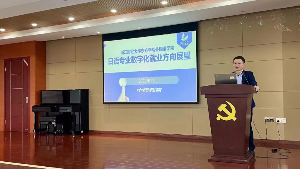 11月10日,为深化产学合作,加强实践教学,外国语公司邀请校企合作实习实践基地中竞(浙江)教育科技有限公司副经理刘发骏,在J7-409报告厅为公司师生作了题为“日语专业数字化就业方向展望”的专题讲座。JINNIAN金年会副经理周春霞主持本次讲座,日语专业教师及员工参加了本次讲座。